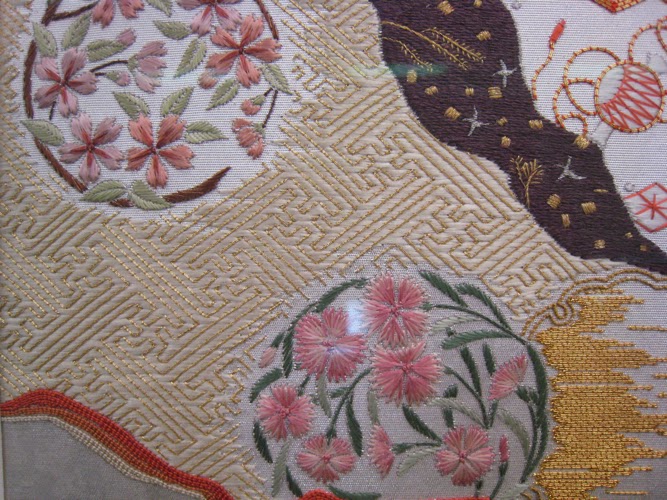 Students from the Japanese Embroidery Center are staffing the exhibit and acting as docents. They can answer your questions about the various techniques. My thanks to one of them, Christine Kellogg, for graciously permitting me to take a detail promotional photograph of one of her pieces. I wanted a picture to give a hint of the beauty that awaits, without showing you all too much, as you need to treat yourselves.